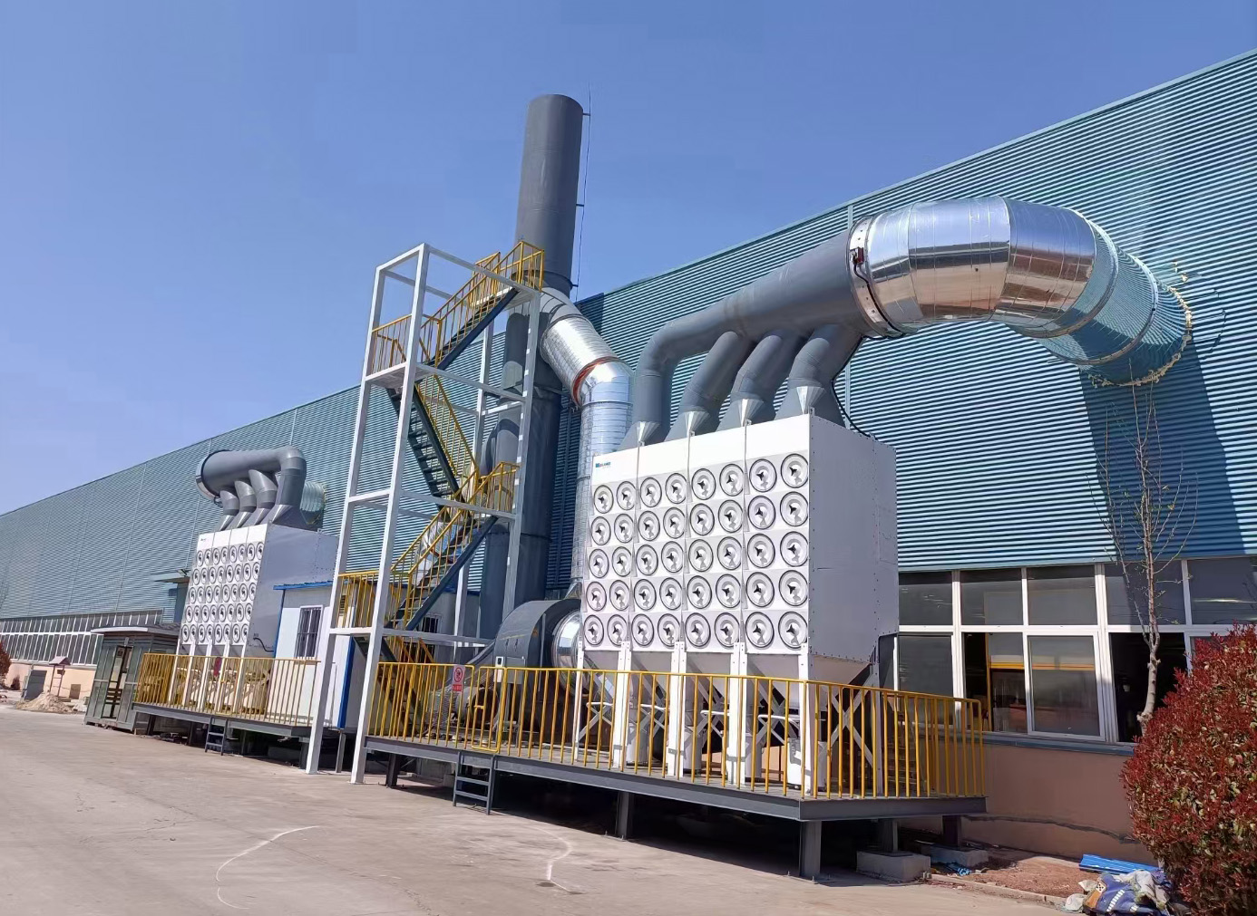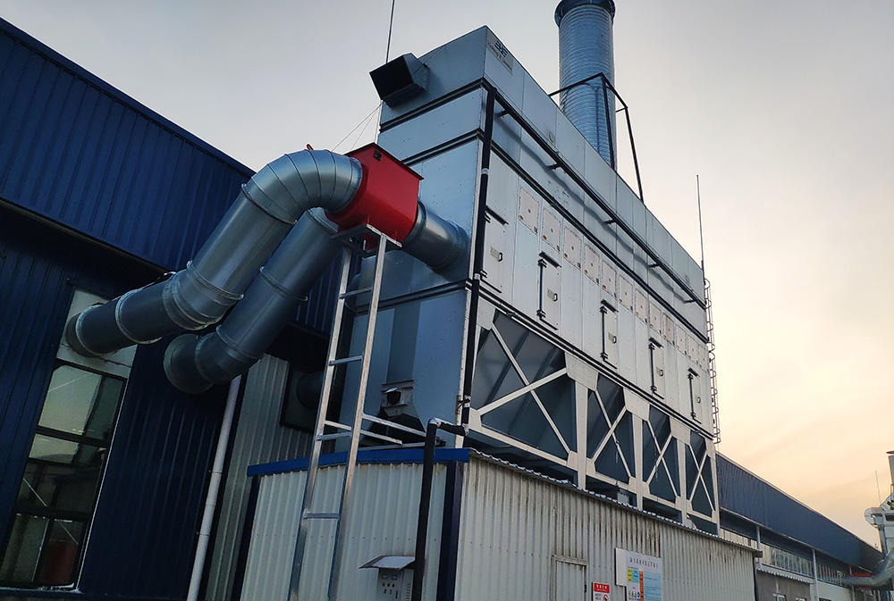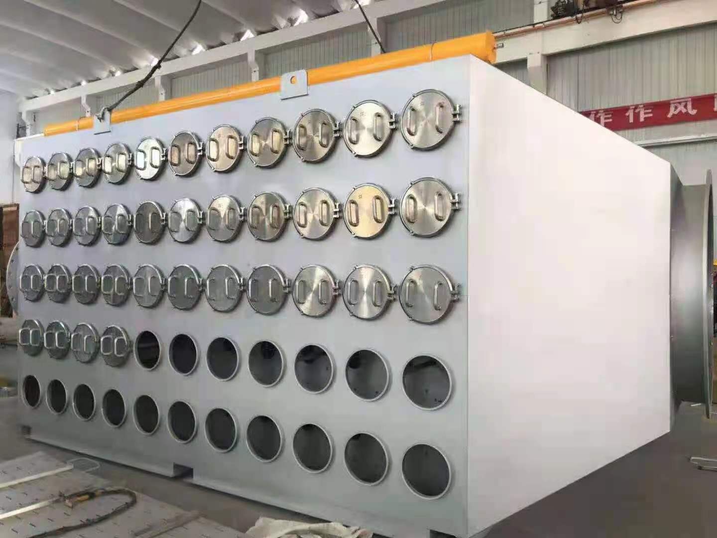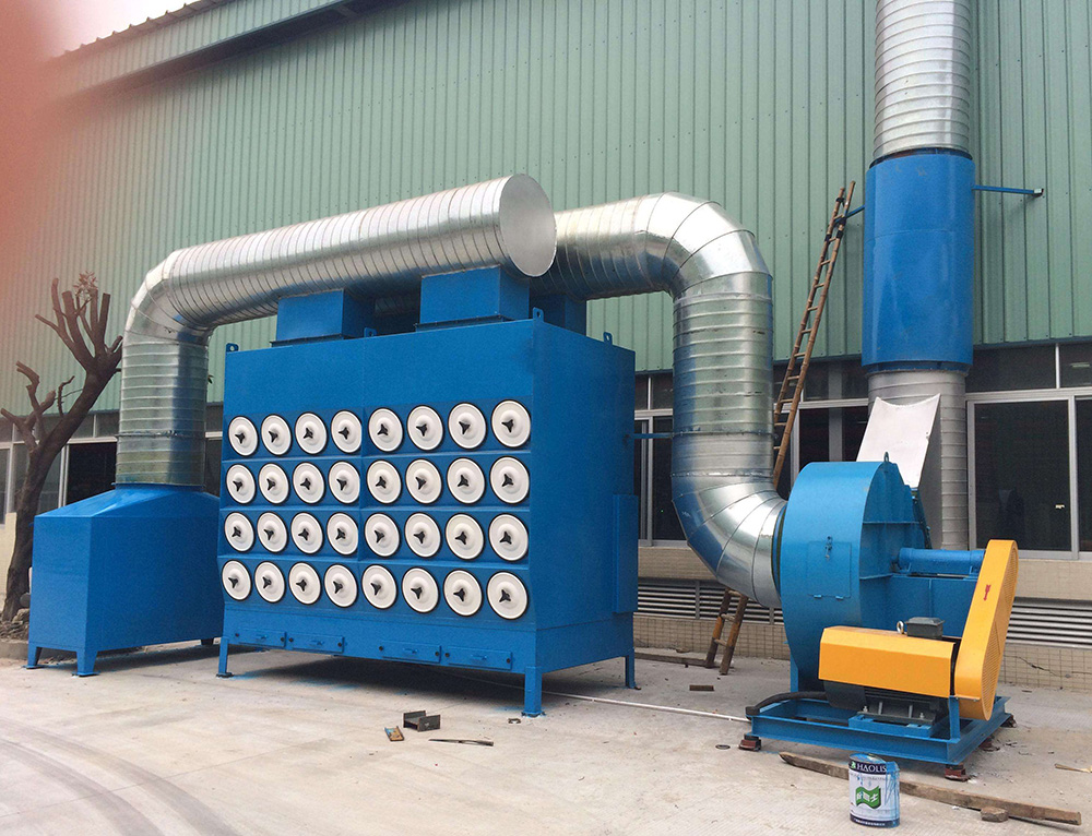 含尘气体从除尘器的进风管进入各分室灰斗,并在灰斗导流装置的导流下,大颗粒的粉尘被分离,直接落入灰斗,而较细粉尘均匀地进入中部箱体而吸附在滤筒的外表面上,干净气体透过滤筒进入上箱体,并经各离线阀和排风管排入大气。随着过滤工况的进行,滤简上的粉尘越积越多,当设备阻力达到限定的阻力值(一 般设定为1500Pa) 时,由清灰控制装置按差压设定值或清灰时间设定值后,按设定程序打开电控脉冲阀,进行停风喷吹,利用压缩空气瞬间喷吹使滤筒内压力骤增,将滤筒上的粉尘进行抖落(即使粘细粉尘亦能较彻底地清灰)至灰斗中,由排灰机构排出。
